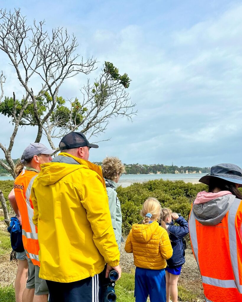 FROM LEFT TO RIGHT: Observing kuaka through binoculars at Clifton Road, December 2023; Students from Cockle Bay Primary at Clifton Road, December 2023; Kuaka waiting for the tide to go out just little bit more, having just arrived from their Manukau Harbour feeding grounds; Students from Cockle Bay Primary learning about flora and fauna; Students from Cockle Bay Primary conducting Marine Metre Squared surveys at Shelly Beach, December 2024.